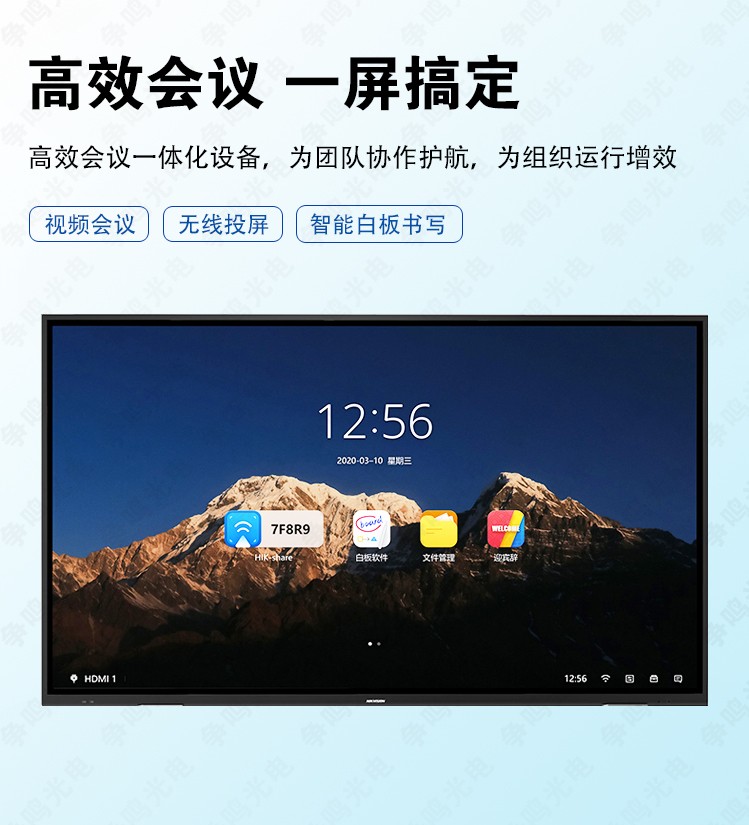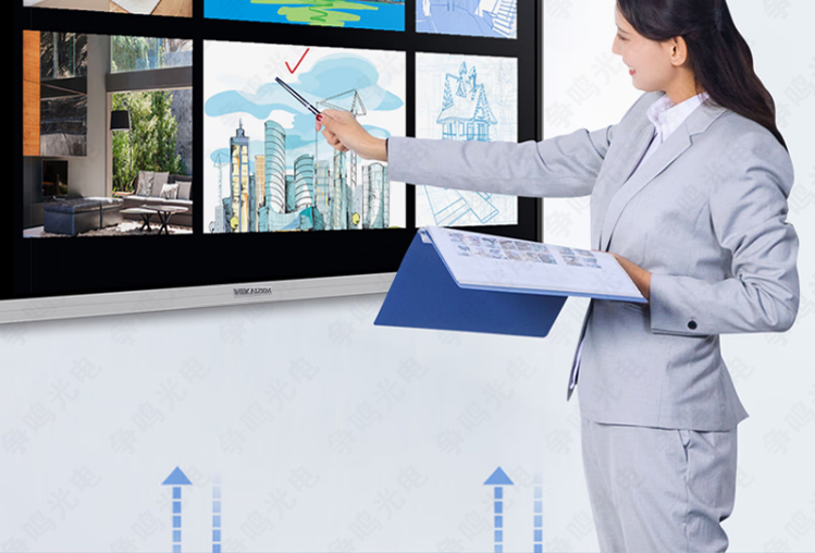 海康威视智能交互会议平板集电脑、投影仪、电子白板、音响、 摄像头、蓝牙遥控(选配)、高清电视、广告机等设备功能于一 体,具备书写、批注、多屏互动、提笔检测、远程视频(选配) 等功能,融合4K高清显示、红外触控、人机交互、多媒体信息处 理和网络传输等多项技术。 智能交互会议平板主要适用于各种 类型办公室、会议室、多媒体教室、展馆、展厅、医疗会诊、培训辅导、活动教育中心以及远程视频会议。
