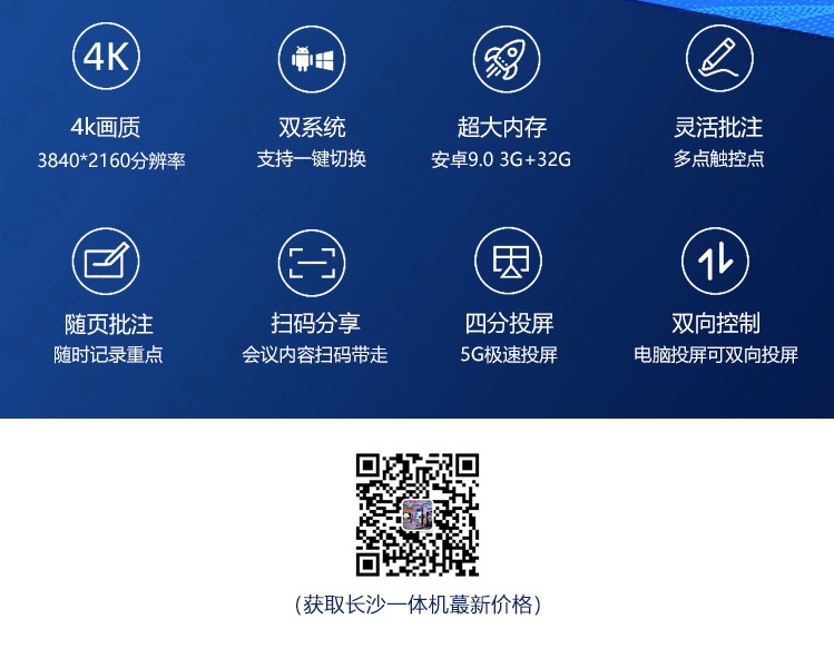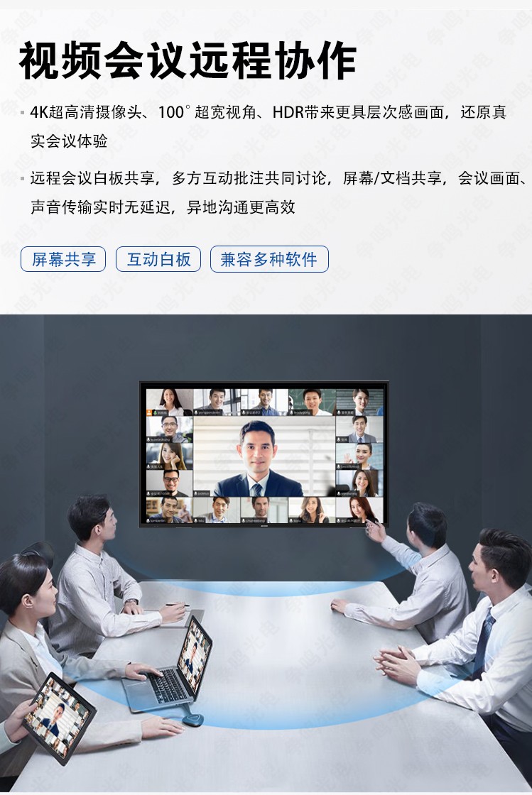 协同办公,沟通零距离:支持软、硬件视频会议,远程协作 零距离;大型场景多屏互动,触摸书写大屏同步显示;