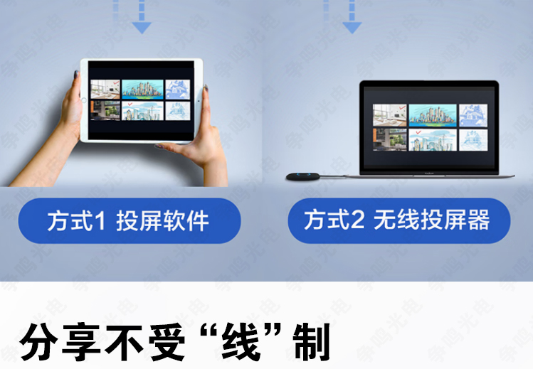 无线投屏, 展示无“线”制:笔记本/台式机/手机/pad无线 投屏,接线困扰统统不再;支持二分屏/四分屏,方案对比更 直观
